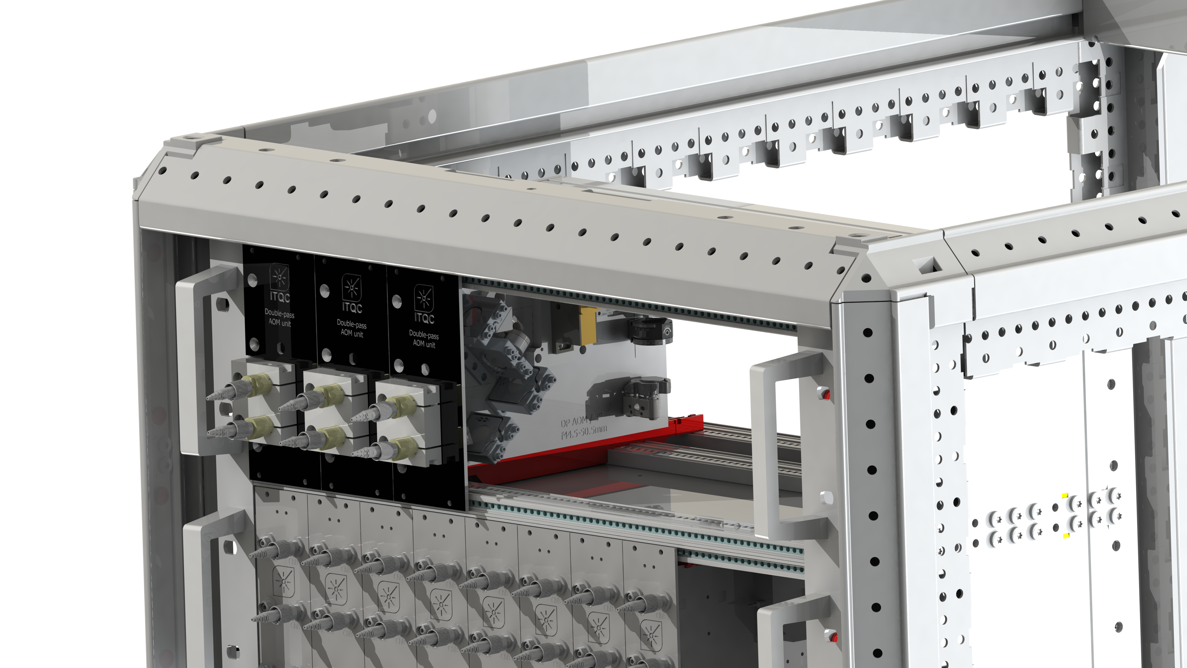 Over the course of 3 months, I implemented a double pass architecture that makes use of a polarizing beam splitter and cat's eye retroreflector. The final device is rack mountable and with a simple I/O terminal consisting of polarization-maintaining optical fibers. Illustrations of the final board are shown in the images.